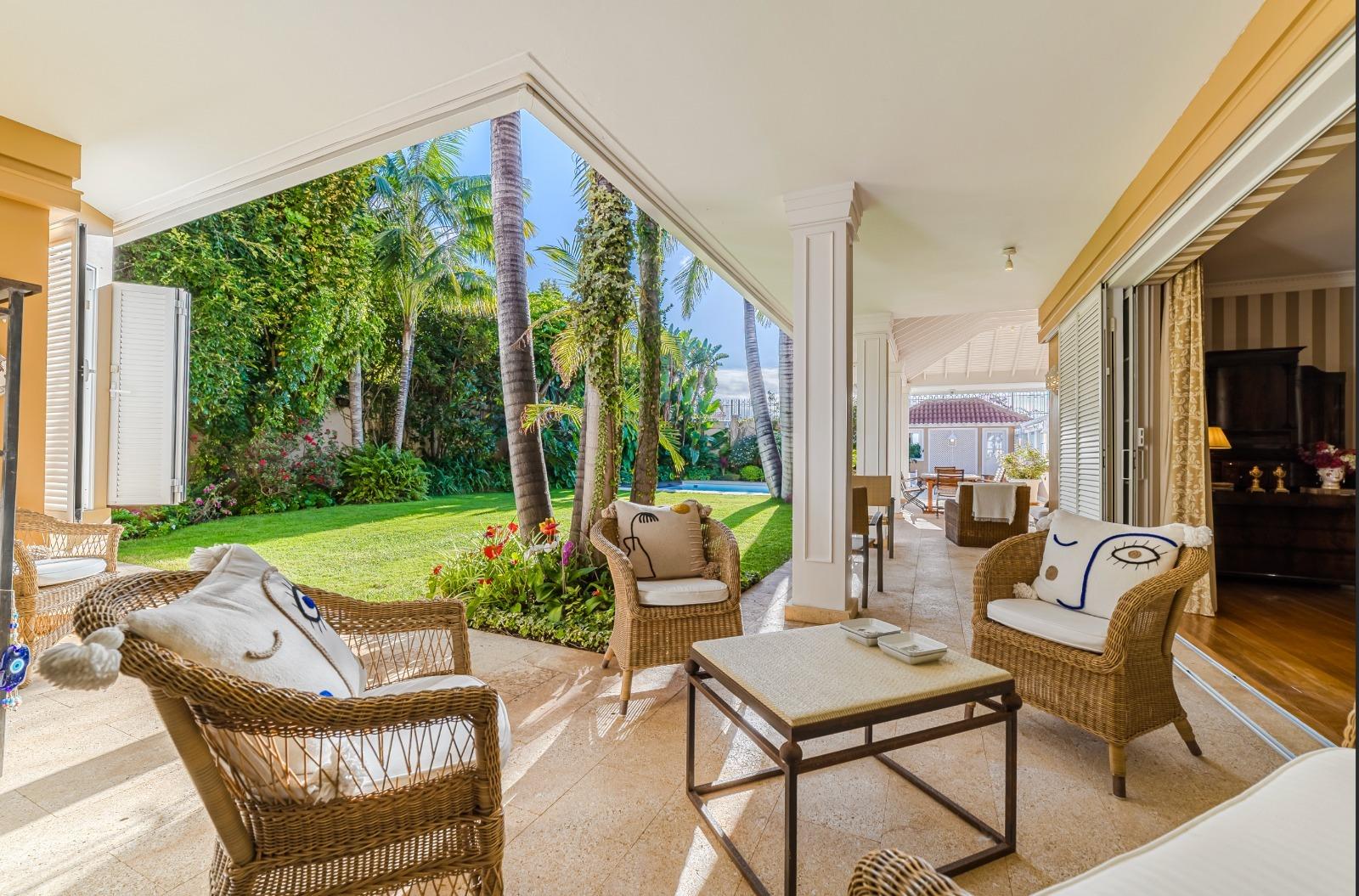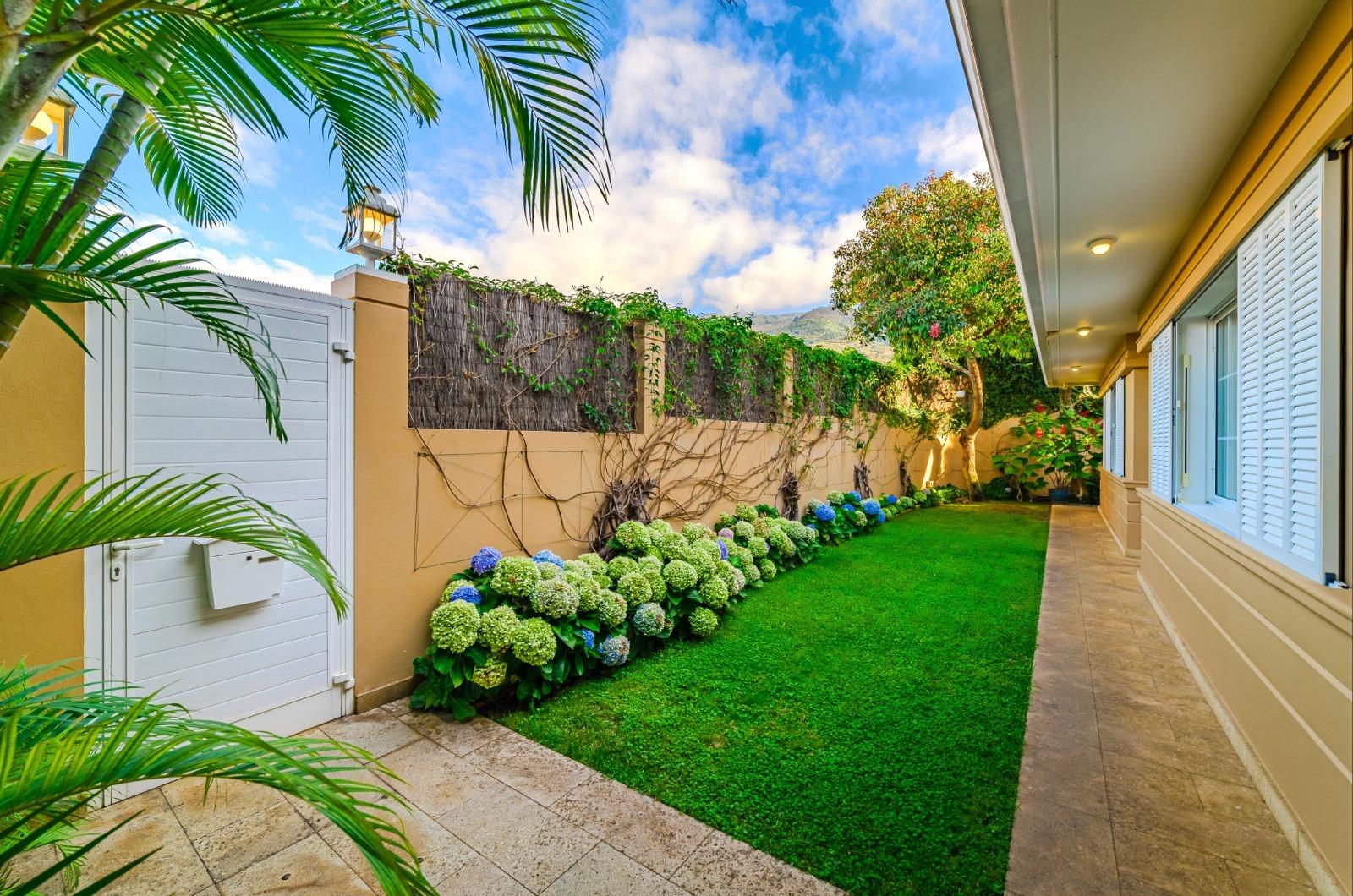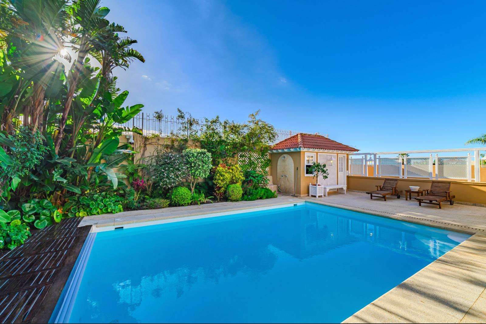 El exterior es un auténtico refugio de tranquilidad: un amplio jardín de 674 m², cuidadosamente diseñado con plantas y árboles, rodea la piscina y crea espacios ideales para el descanso y la recreación. La propiedad cuenta con terrazas en la primera planta y en la planta baja dispone de una veranda orientada al suroeste, desde donde se disfrutan vistas privilegiadas al majestuoso Teide. Además, existe la posibilidad de construir una terraza adicional con vistas al mar, ampliando las perspectivas panorámicas de la villa.