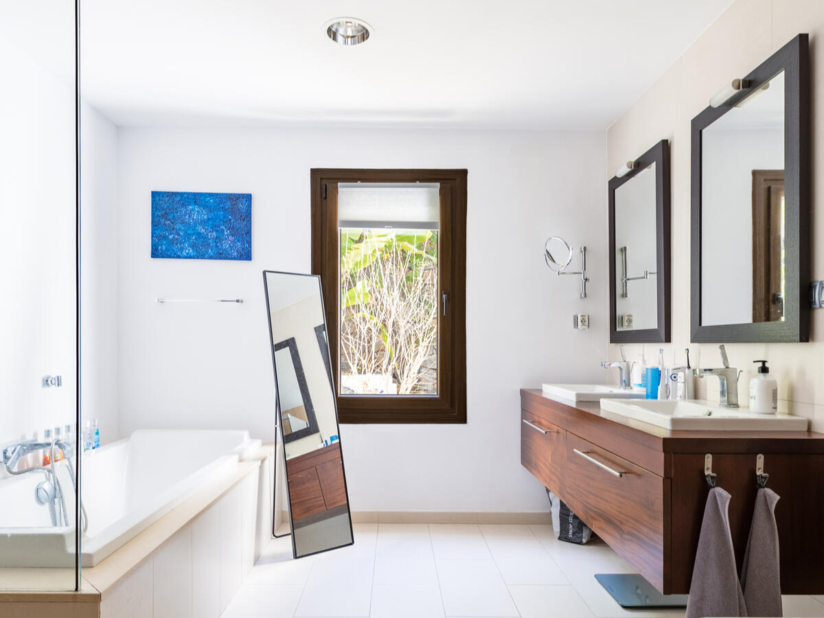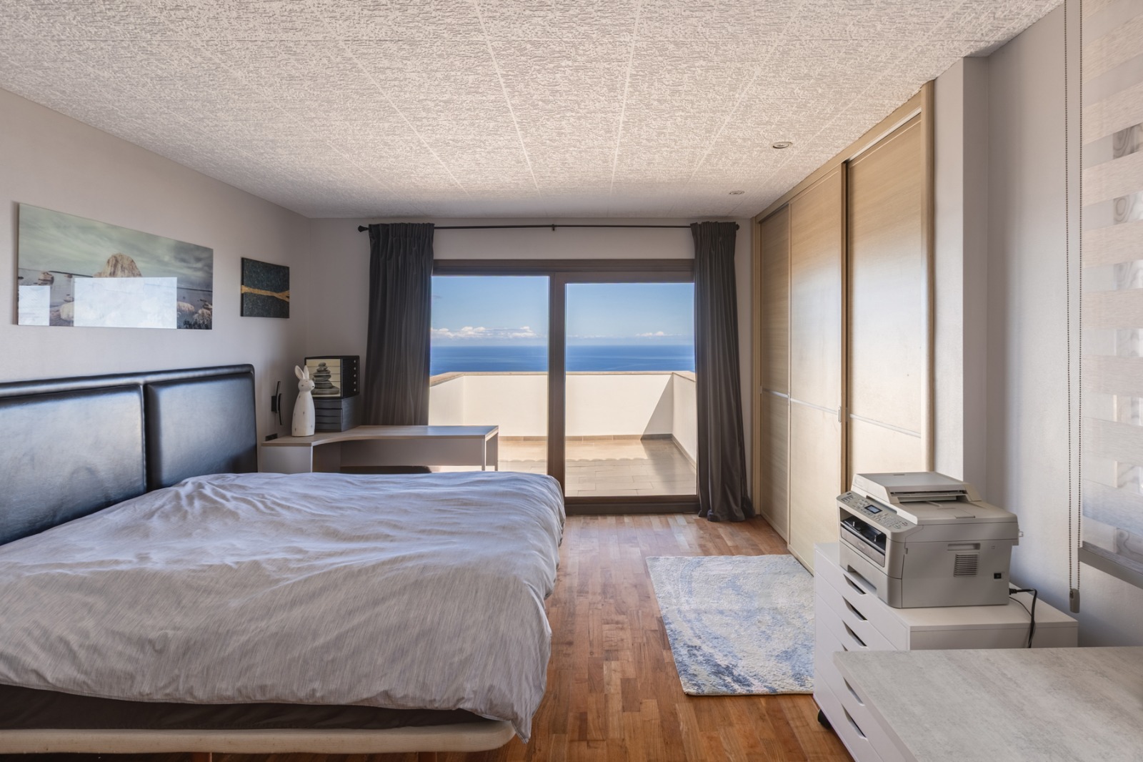 Im Obergeschoss befindet sich ein zweites Wohnzimmer (Fernsehzimmer), das auf einen großen überdachten Balkon mit Blick auf den Teide führt. Im linken Flügel dieser Etage befinden sich zwei Schlafzimmer (oder ein Schlafzimmer und ein Büro) mit einem Badezimmer, das mit Dusche, Toilette, Bidet und Doppelwaschbecken ausgestattet ist. Im rechten Flügel befinden sich ein kleines Büro und ein Hauptschlafzimmer mit eigener Terrasse sowie ein eigenes Badezimmer mit Dusche, Toilette, Bidet und Doppelwaschbecken.