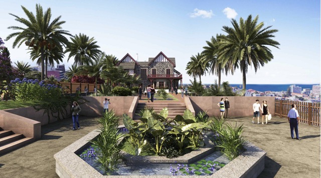 Die Bilder zeigen eine Projektstudie zur Rekonstruktion der alten Villa sowie zwei Gebäude im oberen Bereich des Grundstücks mit Apartments und einem öffentlichen Park.