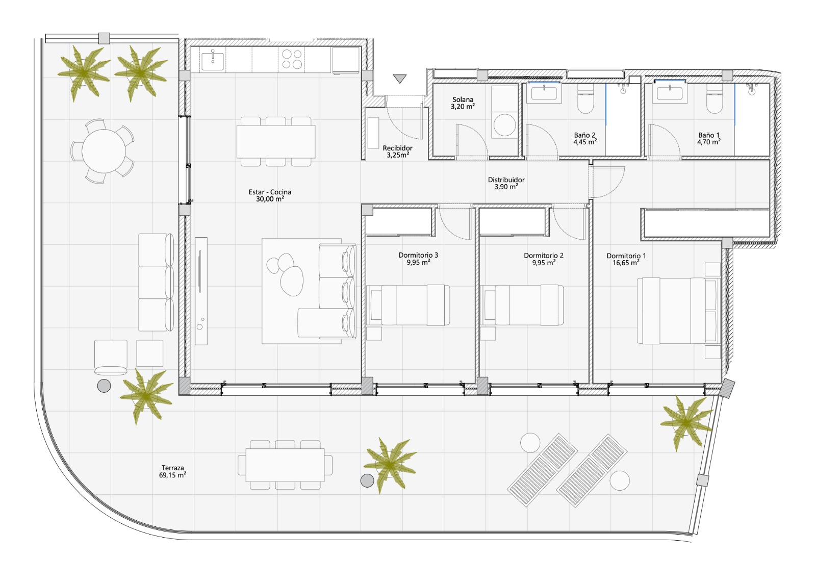 The property features 3 bedrooms, 2 bathrooms, and a spacious 69 m² terrace with stunning sea views and sun all day. It also offers a high-end kitchen with quartz countertops, refrigerator, oven, hob, and built-in cabinets. Additional features include a storage room, parking space, satellite dish, video intercom, and TV and telephone outlets in the living room and bedrooms.