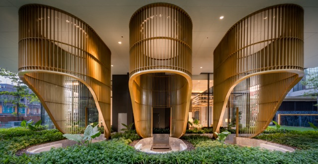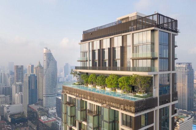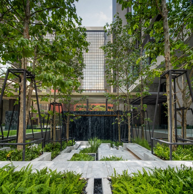 Remarkably, a full two-thirds of the grounds have been reserved for lush green spaces at 28 Chidlom, extending as a series of beautiful garden courtyards between The Tower and The Villa structures. The boundaries between landscaping and living spaces are thus blurred, as foliage native to the environment has been carefully conserved to thrive within the surrounding garden areas.