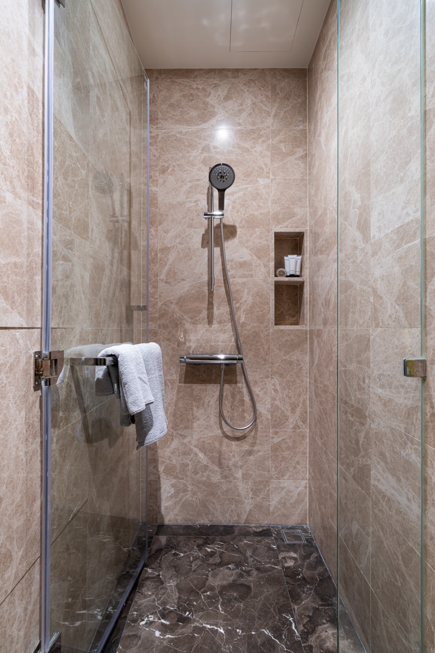 On the 44th floor, a 20-metre long lap pool offers breathtaking views while enjoying a healthy swim for cardio fitness or relaxing plunge to cool off. Cool white and spider green marble surfaces add