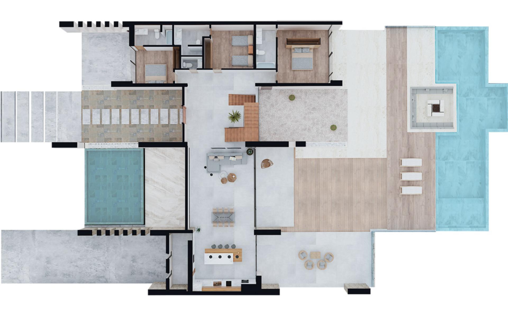 It features 5 spacious bedrooms with en-suite bathrooms and walk-in wardrobes, elegant living areas, and over 100 m² of terraces designed for indoor-outdoor living.