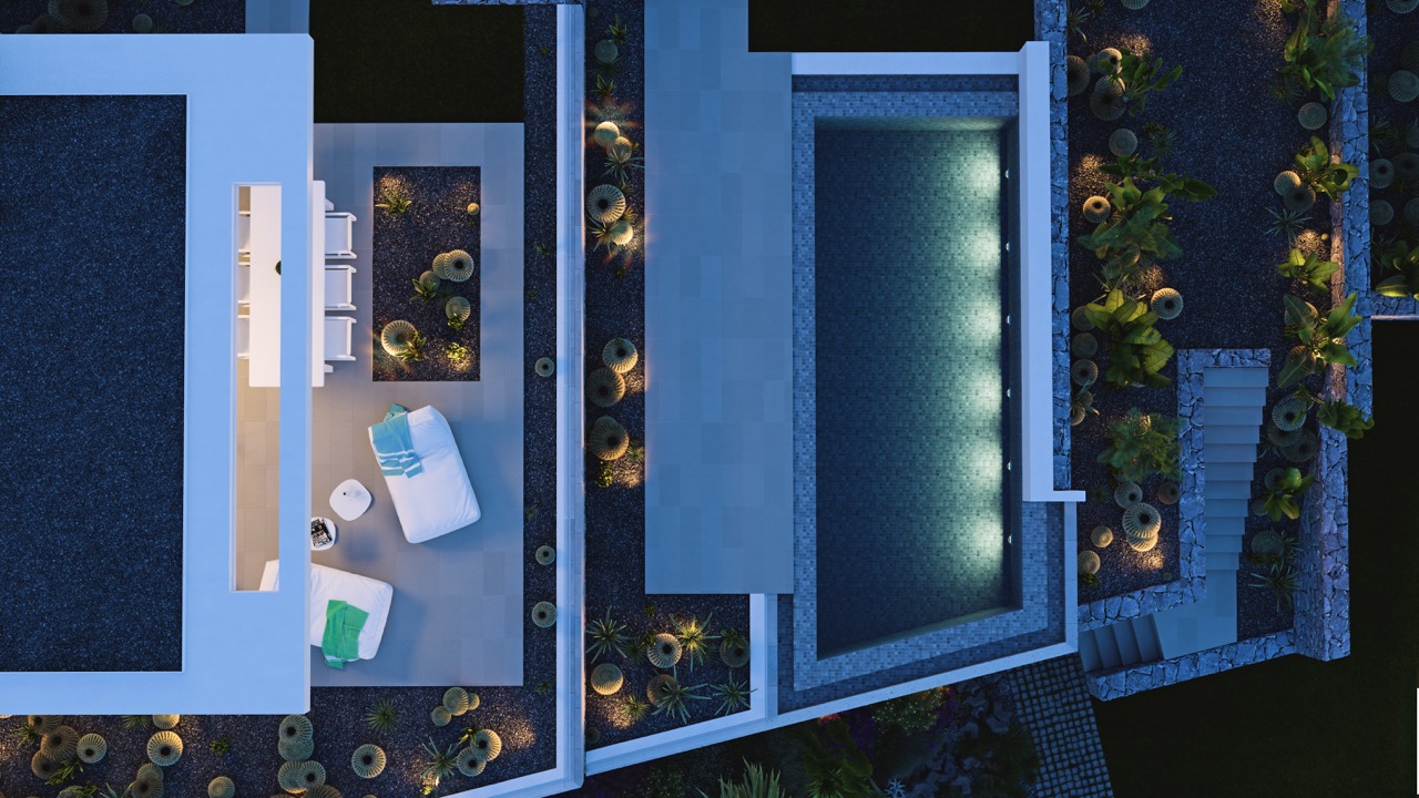 This is the largest villa within the complex and is particularly distinguished by its breathtaking panoramic views over the Sea, which are the true highlight of the property. From the spacious terrace, the private swimming pool, and the beautifully landscaped garden, you can enjoy spectacular sunsets over the sea every day.