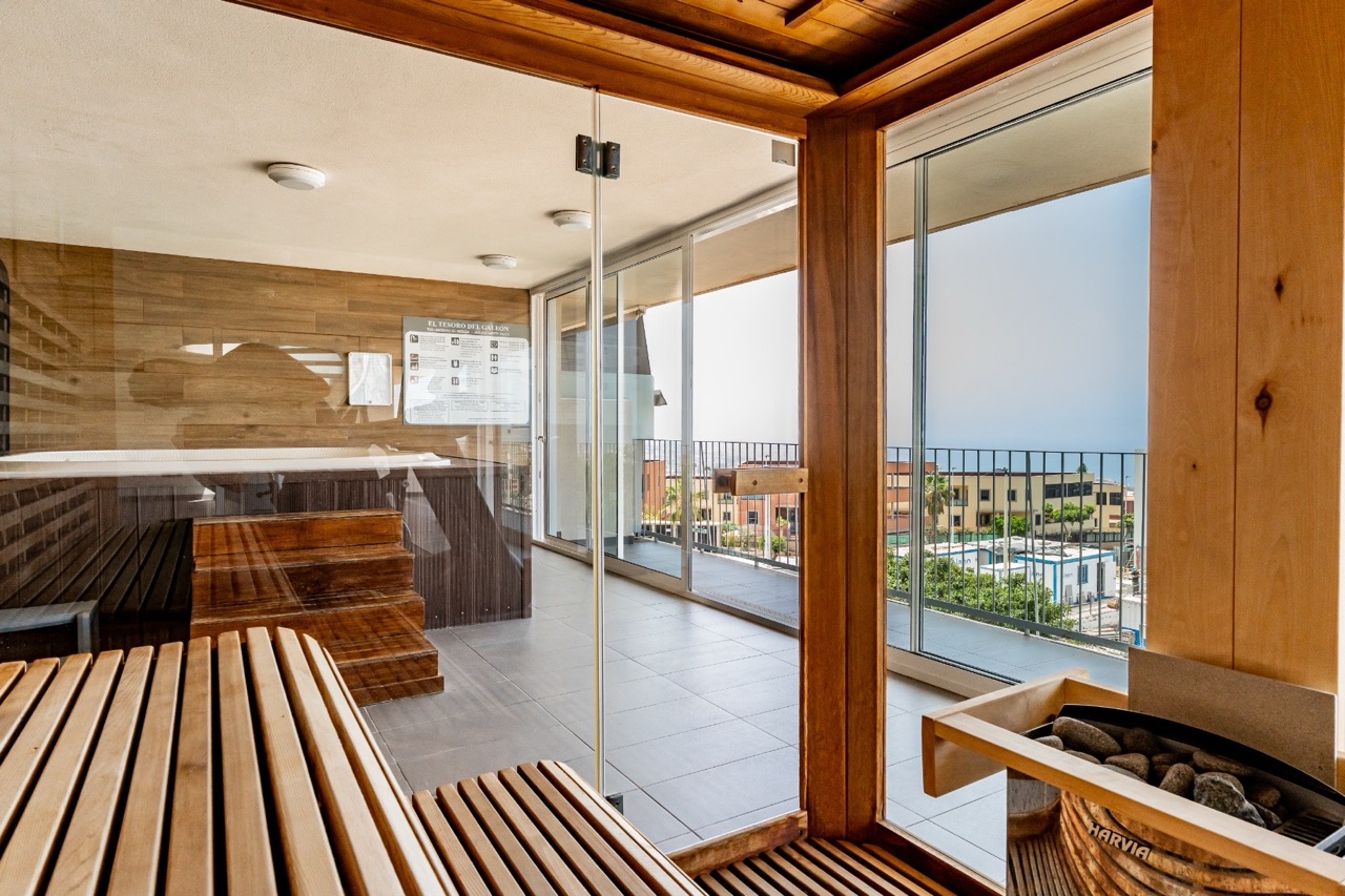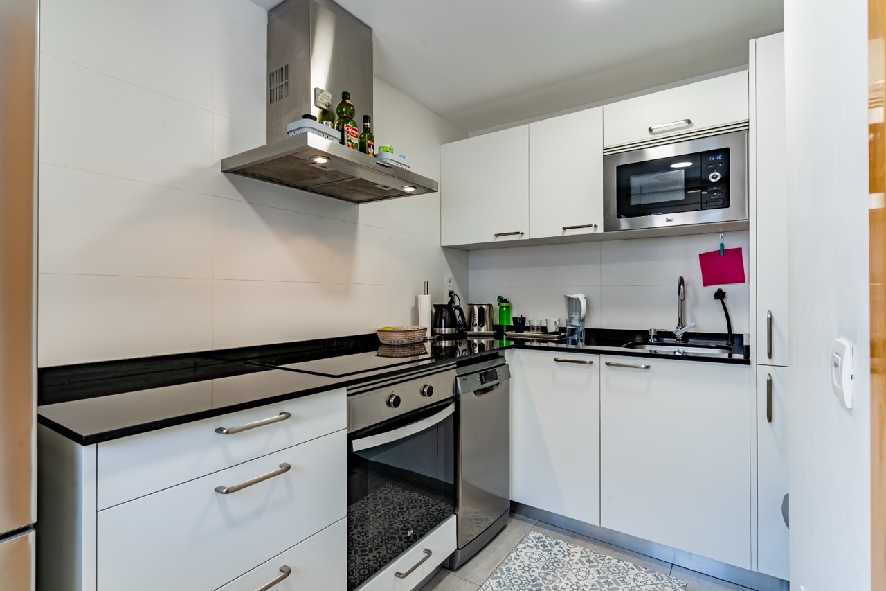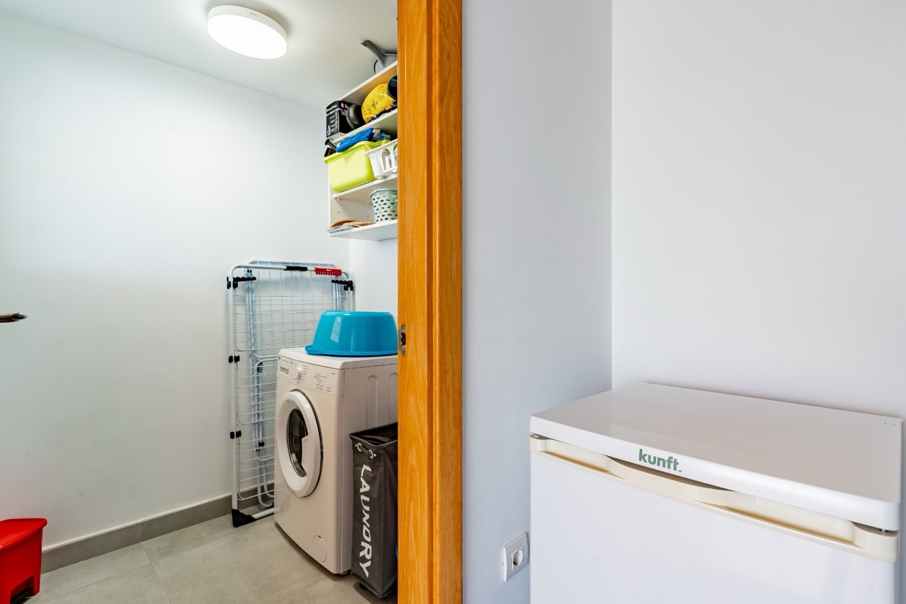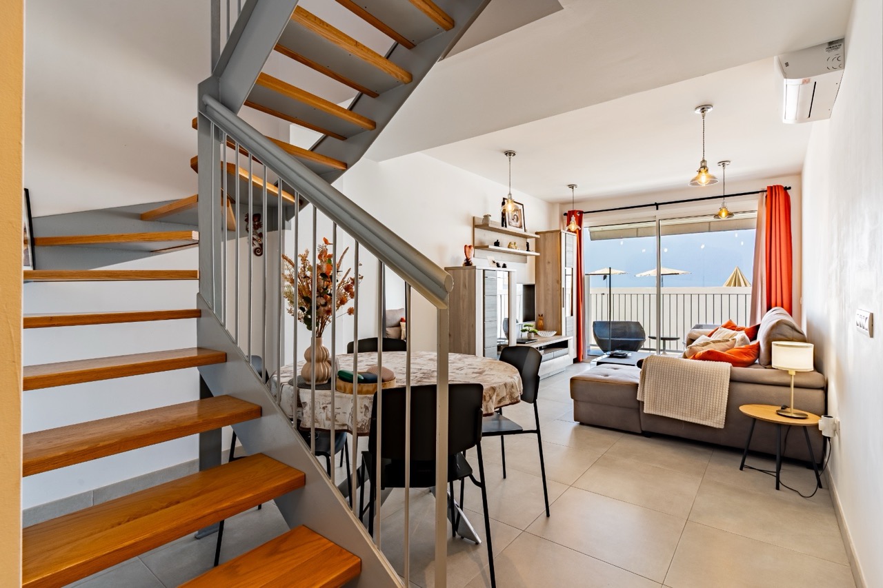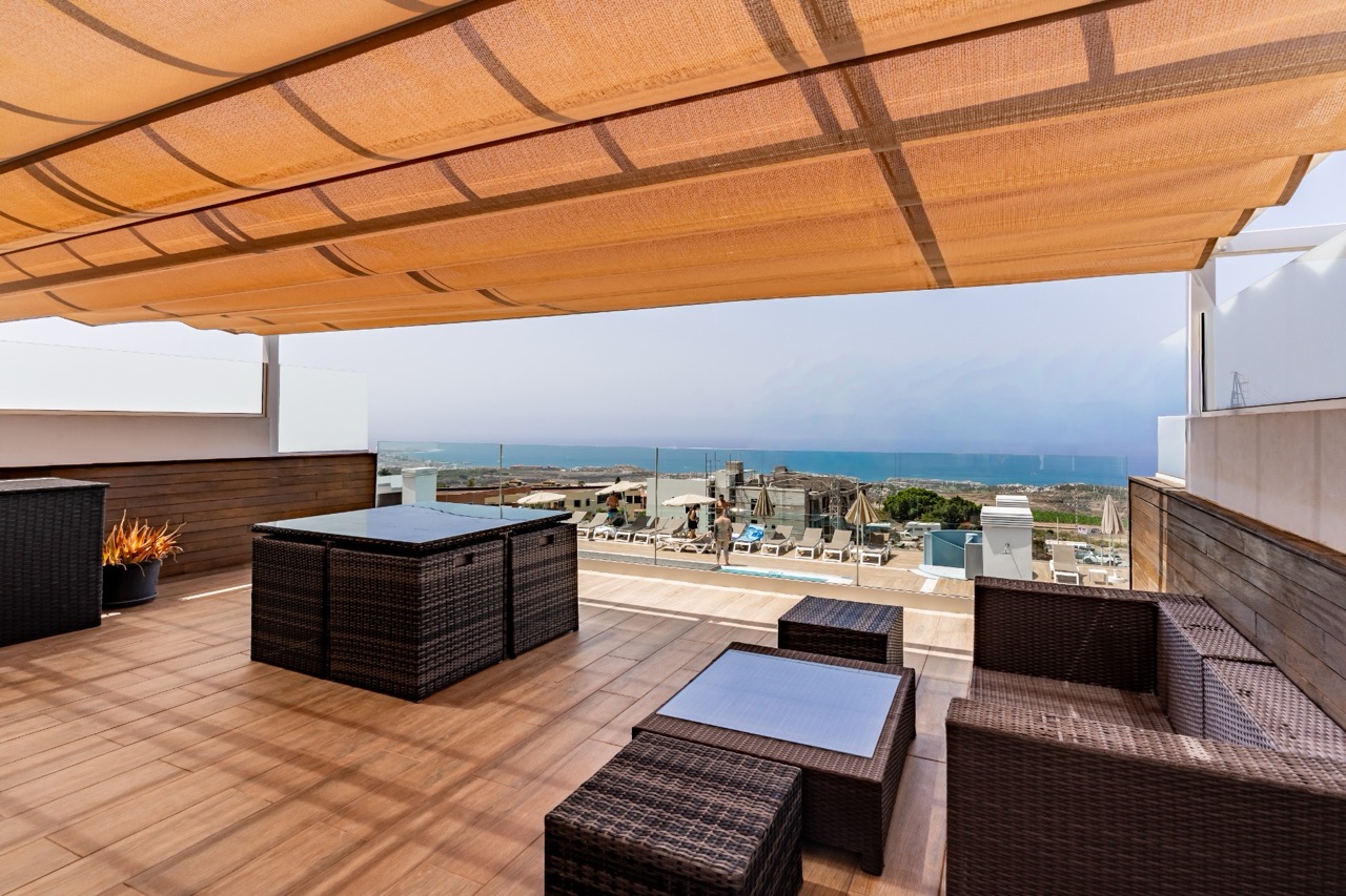 The modern and functional kitchen is fully equipped with high-end appliances and integrates seamlessly into the living area. A private balcony provides light and a sense of space, while an internal staircase leads to the upper level, where an impressive private rooftop terrace offers panoramic views of the sea and the coastline. This privileged space ensures maximum privacy and provides the perfect setting to relax and enjoy the exceptional climate of southern Tenerife throughout the year.